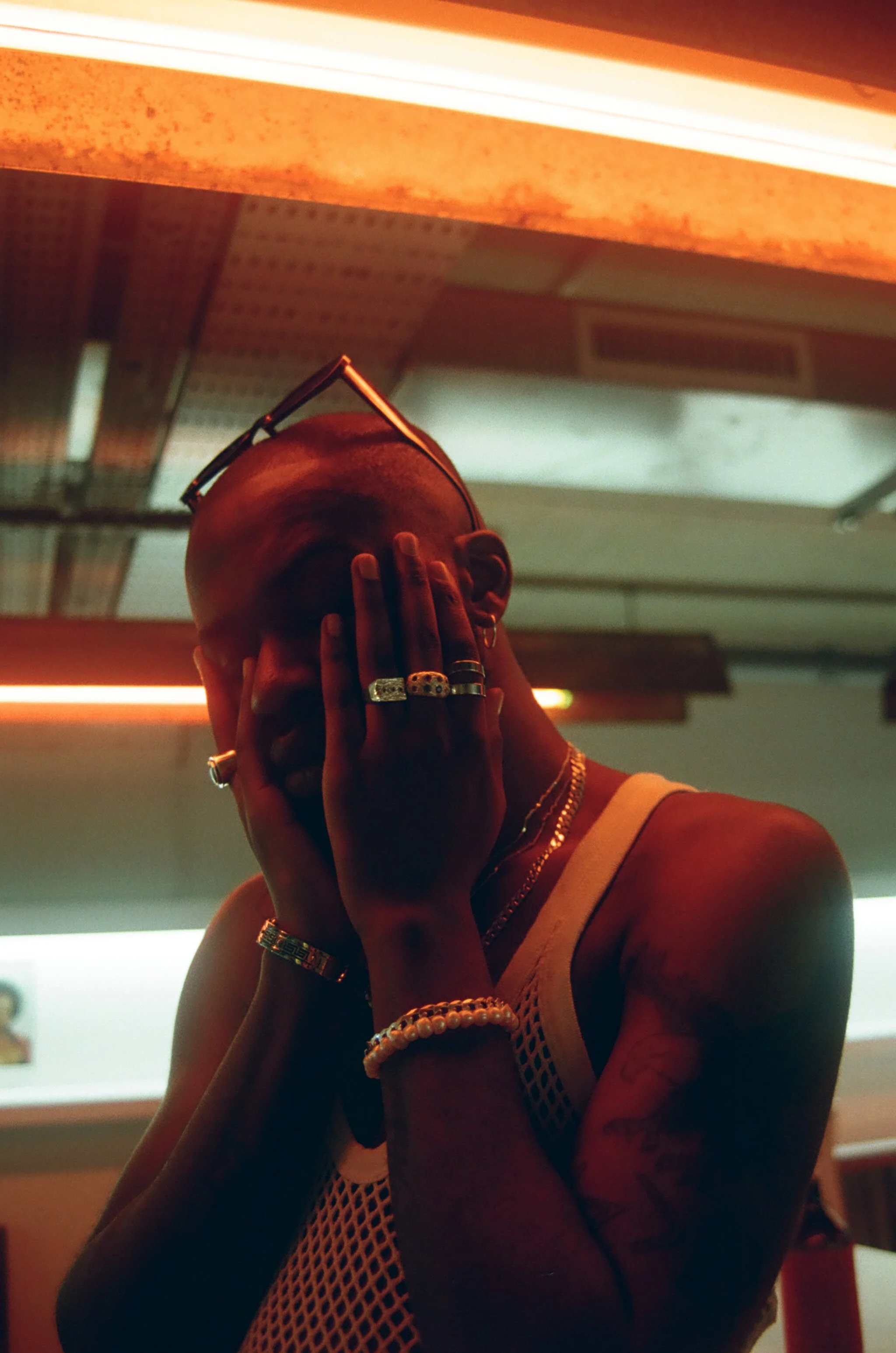 Top, STYLIST OWN, Trousers, FRANCO APPIAH, Jewellery, ARTIST OWN & BLUE BURHAM, Shoes, CROCS
